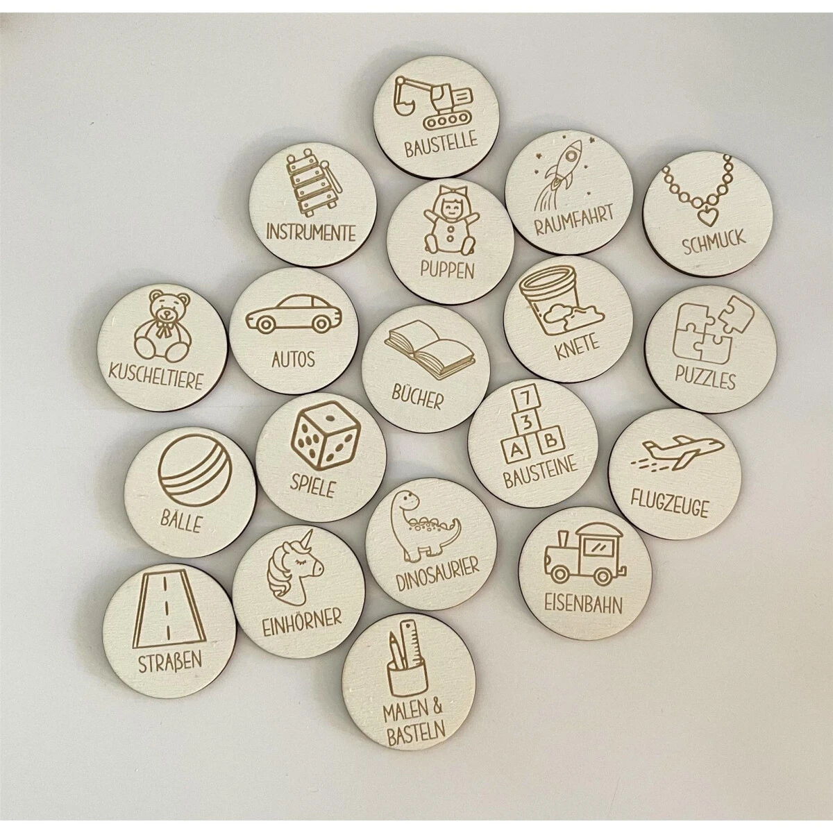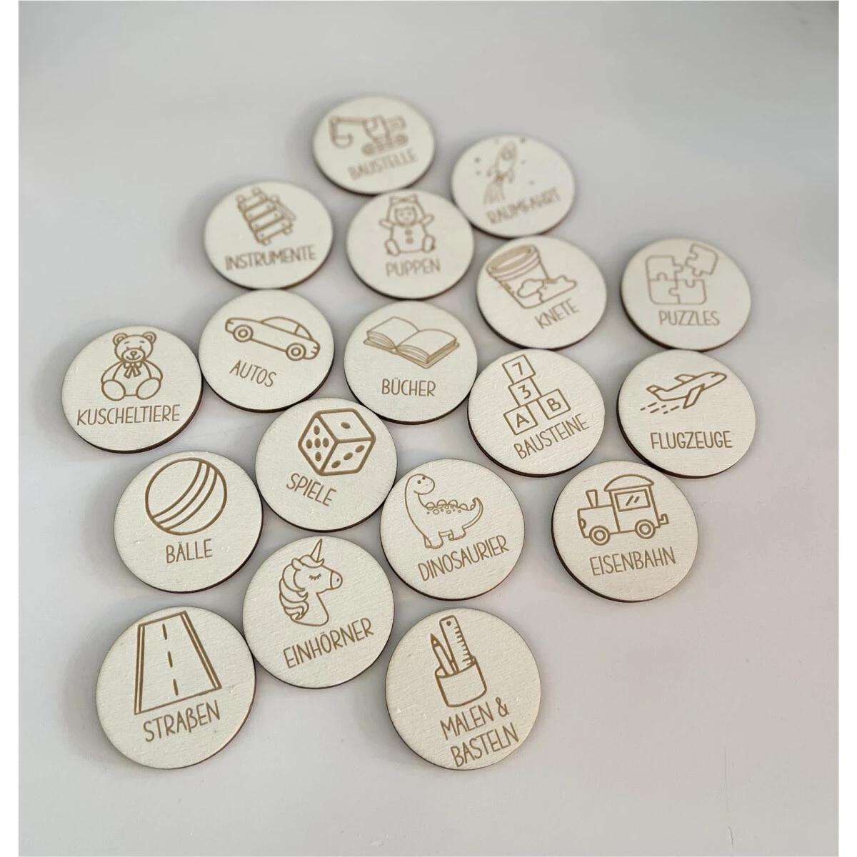 | Motiv | Arztkoffer, Autos, Bälle, Bausteine, Baustelle, Bücher, Dinosaurier, Einhörner, Eisenbahn, Flugzeuge, Instrumente, Kartenspiele, Kaufladen, Knete, Krimskrams, Kuscheltiere, Malen & Basteln, Piraten, Puppen, Puzzles, Raumfahrt, Schmuck, Spiele, Sticker, Straßen, Tiere, Tonies, Verkleidung, Werkzeug |
